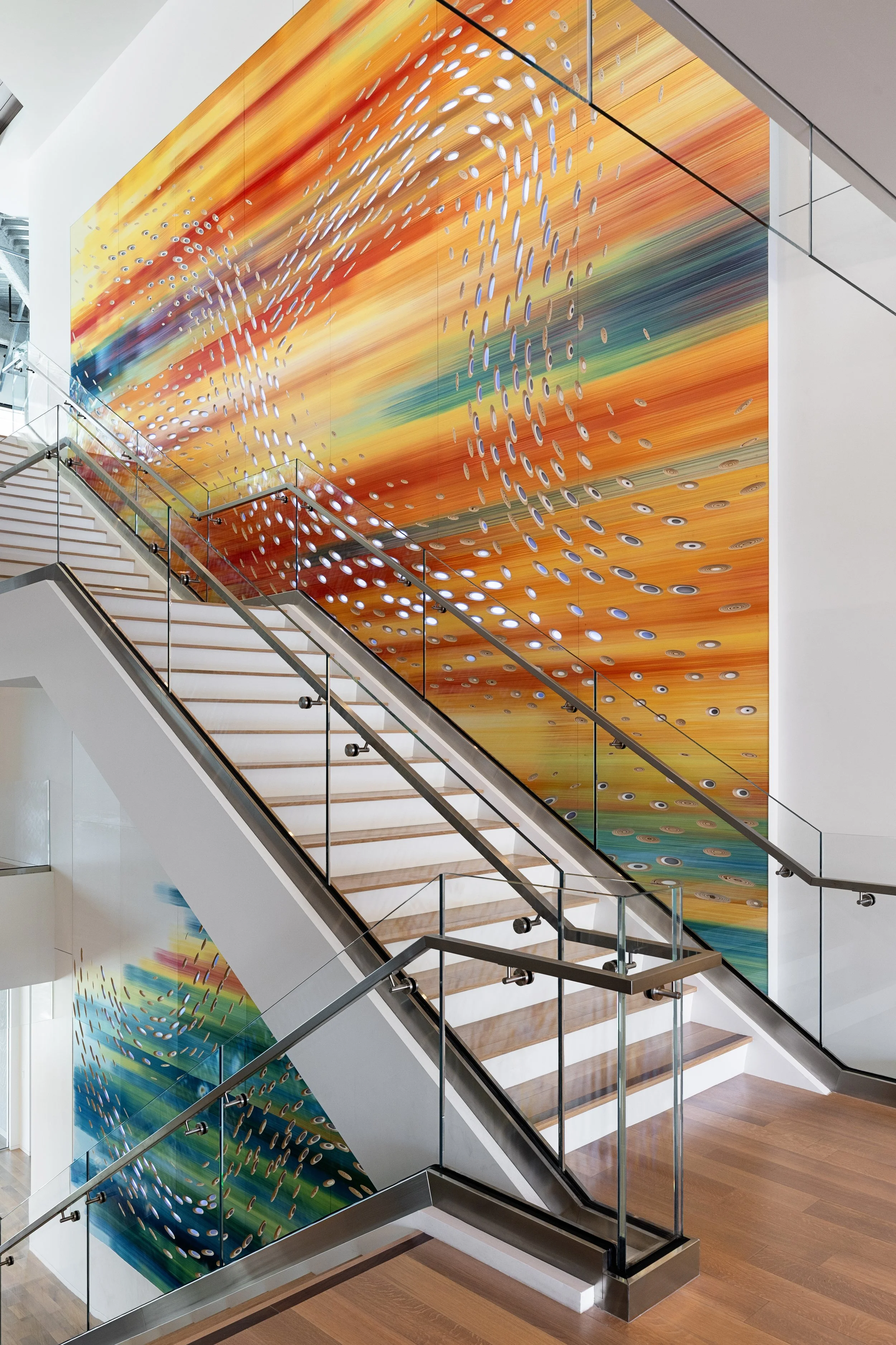 We designed and fabricated a swirling, twisting hanging sculpture that combines visual drama with structural durability. Built from steel, aluminum, wood, and precision cabling, it withstands coastal weather and seismic forces, showcasing Tecture’s expertise in custom, multi-material sculptural installations.